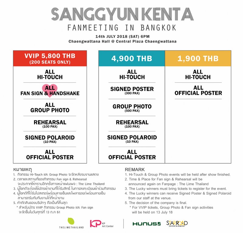 หากใครไม่อยากพลาดความประทับใจดีๆ เคลียร์คิวให้พร้อม และมาเจอพวกเขาได้ในงาน 2018 SANGGYUN KENTA FANMEETING IN BANGKOK ในวันเสาร์ที่ 14 กรกฎาคม 2561 ณ แจ้งวัฒนะฮอลล์ ศูนย์การค้าเซ็นทรัลพลาซ่าแจ้งวัฒนะ เปิดจองบัตรวันอาทิตย์ที่ 17 มิถุนายนนี้ ทาง www.thelimethailand.com บัตรราคา 5,900 (VVIP) / 4,900 และ 1,900 บาท งานนี้บอกเลยว่าสิทธิพิเศษแน่นเอี๊ยด มีแต่คุ้มกับคุ้มล้านเปอร์เซ็นต์ ติดตามรายละเอียดเพิ่มเติมได้ที่เฟซบุ๊คแฟนเพจ https://www.facebook.com/TheLimeThailand/ แล้วมาพิสูจน์ความคิดถึงจากพวกเขาด้วยตัวคุณเอง!!