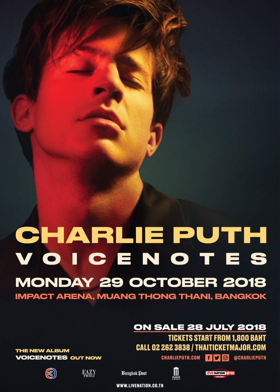 จากปรากฏการณ์บัตรคอนเสิร์ต Sold out ภายในเวลาไม่กี่นาทีเมื่อปี 2559 หนุ่มหล่อเสียงดี เจ้าของเพลง วัน คอล อะเวย์ (One call away) ชาร์ลี พุท (Charlie Puth) เตรียมกลับมาเรียกเสียงกรี๊ดอีกครั้ง กับเวิลด์ทัวร์ล่าสุด “ชาร์ลี พุท วอยซ์โน้ตส์ ไลฟ์ อิน แบงค็อก 2018” (Charlie Puth Voicenotes Live in Bangkok 2018) ที่จะมีขึ้นในวันที่ 29 ตุลาคม 2561 ณ อิมแพค อารีน่า เมืองทองธานี
