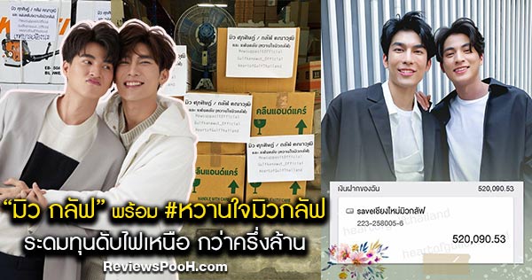 ซึ่งสองหนุ่มคู่บุญ “มิว กลัฟ” และหวานใจได้เปิดระดมทุนแจ้งข่าวผ่านทางแฟนเพจของทั้งคู่ 3 ช่องทางหลัก @GulfKanawut_Official @Heart of Gulf Thailand และ @Mewsuppasit Official เมื่อช่วงต้นเดือนเมษายนที่ผ่านมา ที่ร่วมกันระดมทุนหารายได้ จนยอดสมทบทั้งสิ้น 520,090.53 บาท