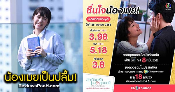 คาแรกเตอร์ สาวยิ้มแฉ่งแข่งตะวัน ของ “เมย” ในละคร “อกเกือบหักแอบรักคุณสามี” ทางช่อง 3 ทำเอา นางเอก “มิว-นิษฐา จิรยั่งยืน” ยิ้มแป้นยาวๆ เพราะหลังออกอากาศไปได้เพียง 3 ตอน กระแสตอบรับแฟนละครที่ไทยสุดปัง โดยเรตติ้งทั่วประเทศอยู่ที่ 3.8 ส่วนทั่วประเทศ (15+) อยู่ที่ 3.98 แต่ที่นำโด่ง คือ ในพื้นที่กรุงเทพ อายุ 15 ปีขึ้นไป หรือ BU (15+) สูงถึง 5.18